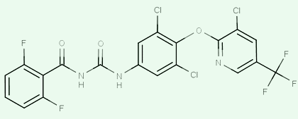 苯甲酰脲類昆蟲生長調(diào)節(jié)劑。廣譜性殺蟲劑,以胃毒作用為主,兼有較強(qiáng)的觸殺作用,滲透性較差,無內(nèi)吸作用??梢种茙锥≠|(zhì)形成,阻礙害蟲正常蛻皮,使幼蟲蛻皮、蛹發(fā)育畸形,以及成蟲羽化,產(chǎn)卵受阻,從而達(dá)到殺蟲的效果。對多種鱗翅目害蟲及雙翅目、直翅目、膜翅目害蟲有效。還可用于甘藍(lán)、棉花、茶樹、果樹的多種害蟲。